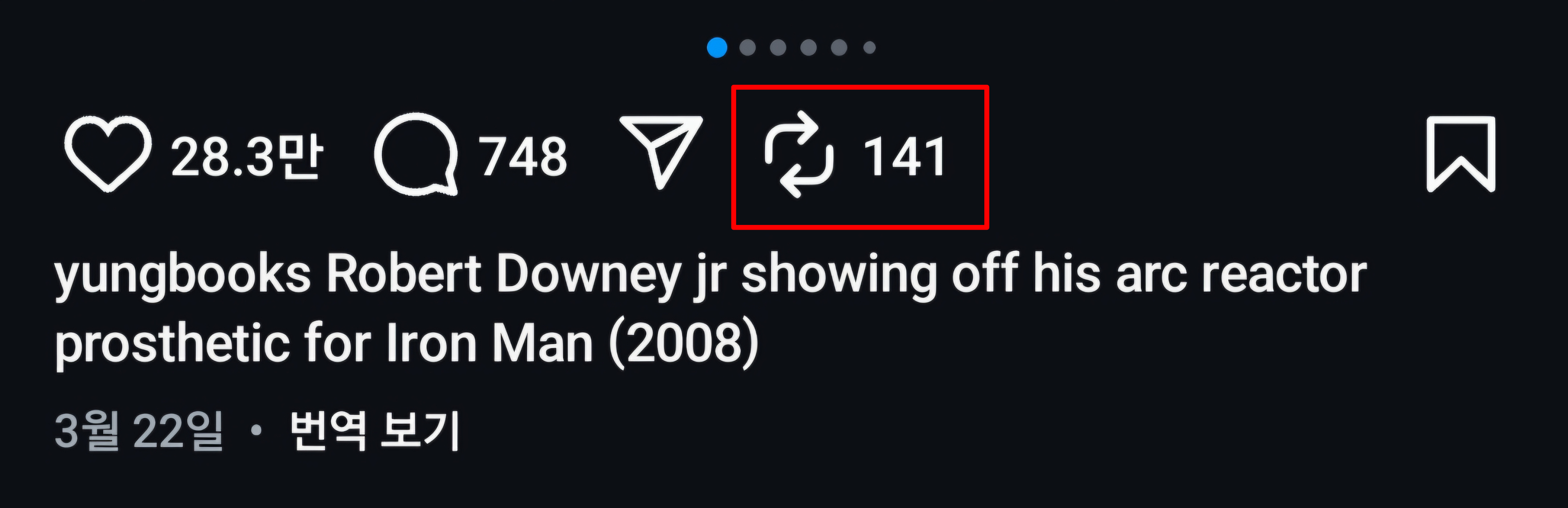 위 사진과 같이 오른쪽에 있는 기능이 리포스트 기능인데요, 리포스트 기능을 누르면 자신의 계정에 리포스트한 게시물이 올라오게 됩니다.